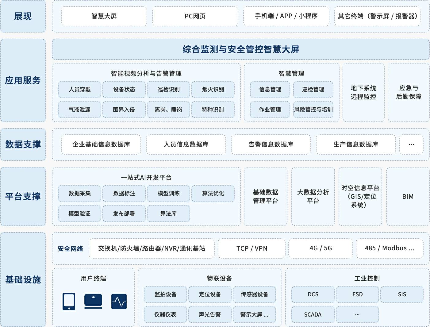 针对矿山安全生产的管理要求,紧抓需求痛点,易倍体育-易倍体育·(中国)官方网站创新提出“一基础、双支撑、多平台、N应用”的智慧矿山方案,实现不同阶段需求逐步实现未来智慧矿山。易倍体育-易倍体育·(中国)官方网站创新充分利用人工智能算法优势,从智能视频分析风险隐患切入,实现风险隐患全生命周期分析与管理,同时应用智慧化作业流程、智慧检维修提升作业生产效率,应急与后勤保障是重中之重,除了实现地下通风系统、定位系统、电力系统、通讯系统、排水系统以及环境监测系统的全天候监控之外,应急物资管理系统保障物资及时可用,人员设备定位系统保障下井人员位置的实时管控,充分实现应急后勤保障,易倍体育-易倍体育·(中国)官方网站创新智慧矿山方案永远将安全生产放在第一位。